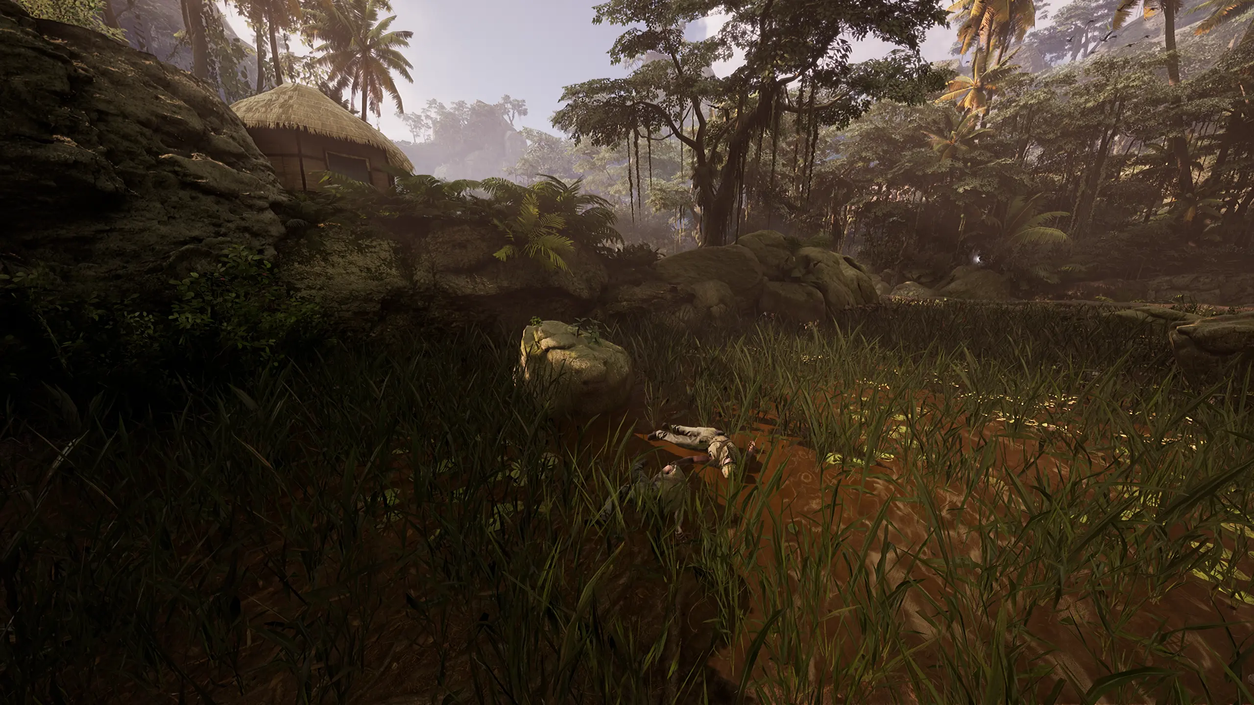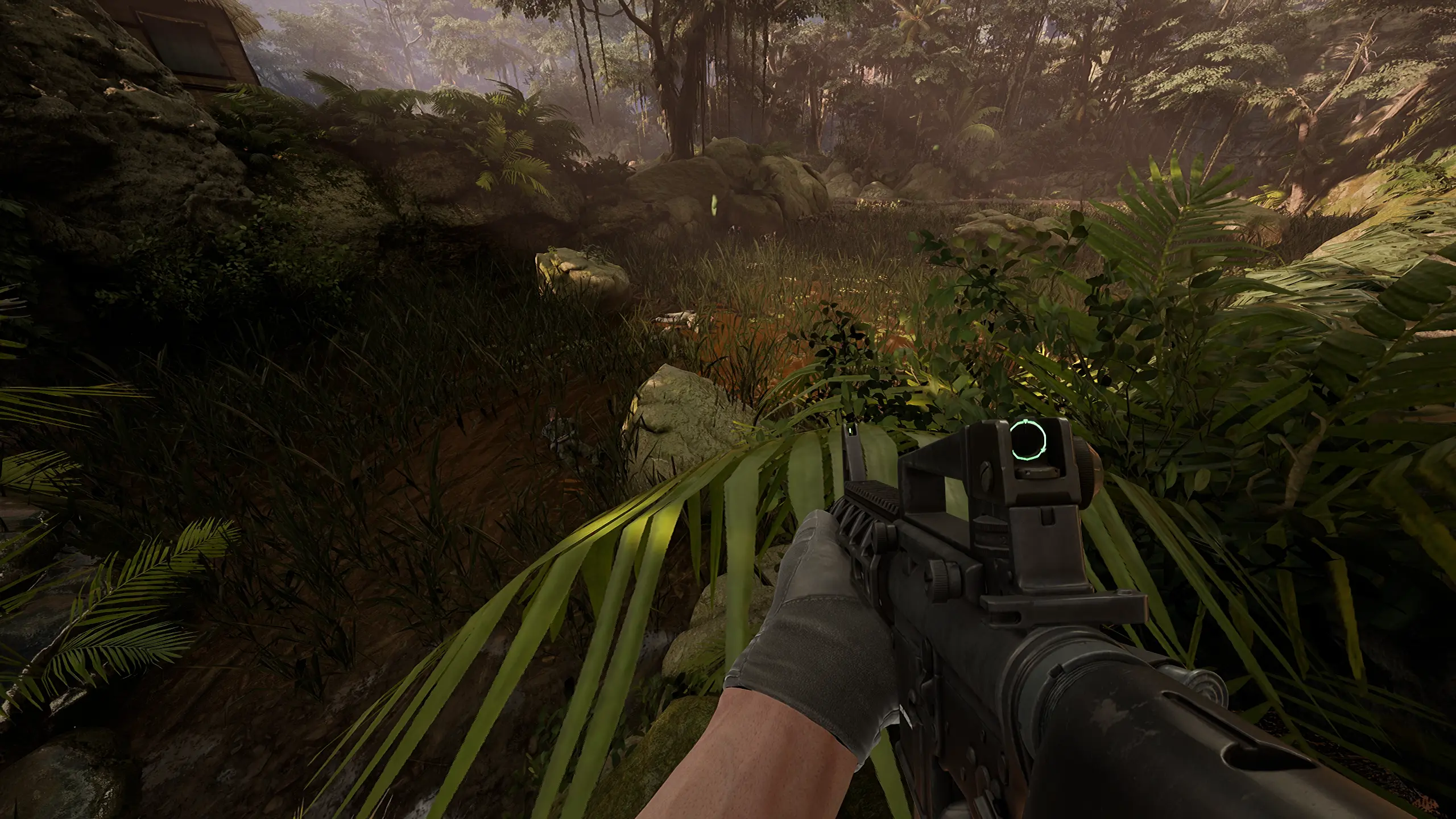 Ranger can once again avoid wading by running  along  the dead branches and dirt at the edge of the paddy. He should head toward the left of the Viet Cong sniper’s perch, since it provides the shortest route up. Several Viet Cong soldiers will try to stop Ranger’s as he approaches.