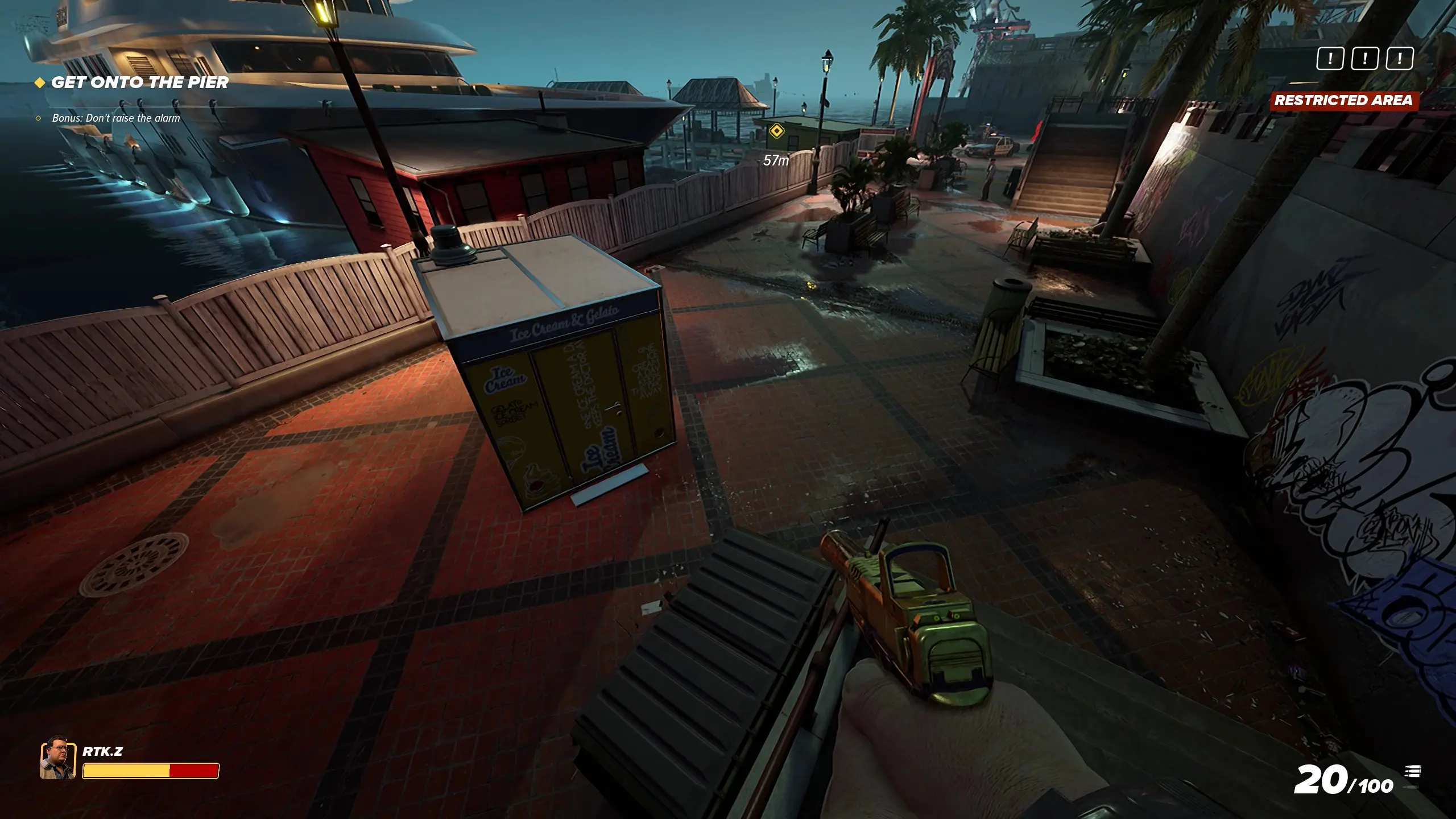 The cops on the pier can significantly slow progression. Players can run along the second, lower pier (if it spawns) or walk on the outside of the railings and use water warping to avoid detection.