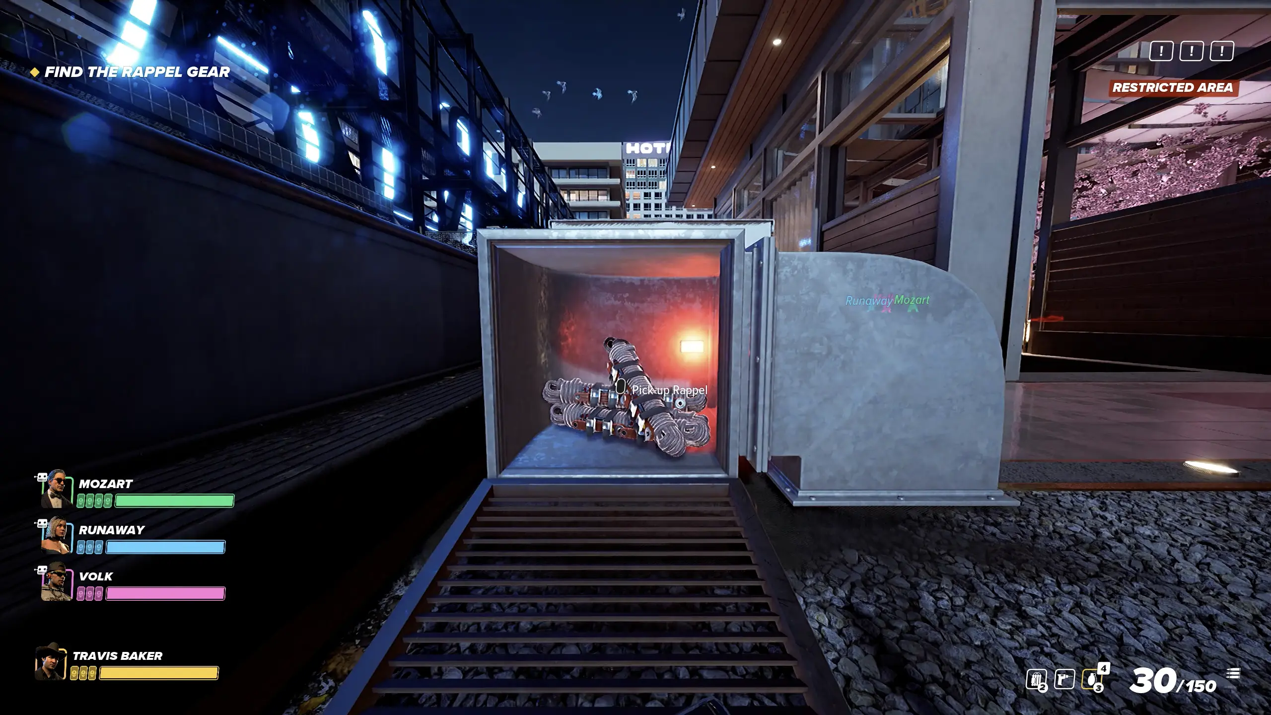 Plant Ziplines is a preparatory story trade mission in A Rich Guest. Gloves’s entry plan requires rappelling equipment so Baker’s crew can reach the lower floors of Imperial Bank from the roof. Touchdown’s contact Dave demands payment of $23,400 up front.